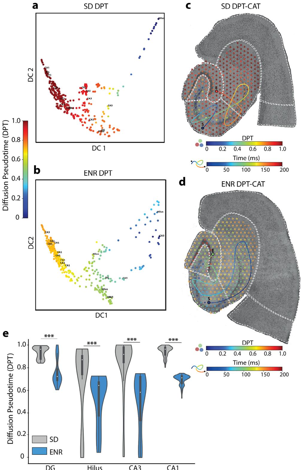 图4. 海马体多尺度动力学分析。a) 基于SRT SD数据的即刻早期基因表达中DPT的差异进展,展示了海马空间区域内细胞的发育轨迹。b) 与(a)相同但基于ENR数据。c) 通过SD数据中DPT与CAT分析的对应关系推断共定位、时空对齐及功能洞察。d) 与©相同但基于ENR数据。e) 量化SD和ENR中互联海马区域的DPT差异进展( ,ANOVA检验)。