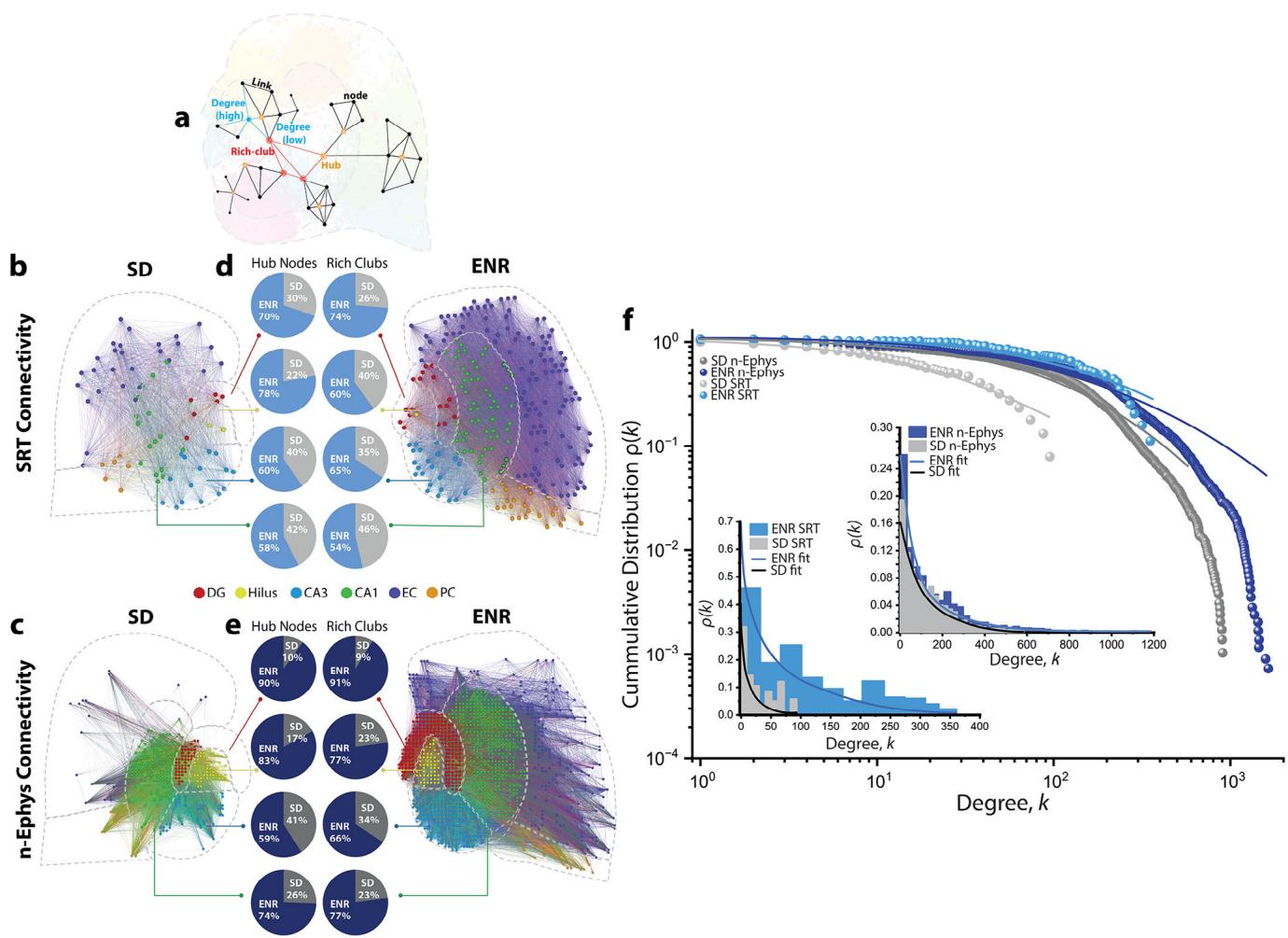 图3. 空间测序连接组与神经功能连接的多尺度网络拓扑分析。a) 关键多尺度图度量示意图,展示了基于急性海马-皮层切片中互联程度定义的特征性枢纽节点和富人俱乐部节点。节点度对应特定节点上的连接链路数量。b) ENR和SD条件下海马互连层中空间即刻早期基因的连接图谱。使用Gephi可视化网络,显示完整测序SD数据(节点 ,连接 )和ENR数据(节点 ,连接 )的总连接。c) ENR和SD条件下海马互连层中时空功能神经活动的连接图谱。使用Gephi可视化网络,显示SD总连接的 (节点 ,连接 )和ENR大规模记录数据(节点 ,连接 )。(b)和©中的图节点按度强度缩放,并根据海马模块关联性着色(见彩色图例)。彩色连线标识簇内与簇间连接。d) SD和ENR不同海马转录组网络中量化枢纽节点与富人俱乐部节点的百分比。e) SD和ENR不同海马功能网络中量化枢纽节点与富人俱乐部节点的百分比。f) 幂律分布表明SD和ENR网络中具有小世界特征的无标度转录组(SRT)-功能(n-Ephys)网络拓扑。ENR网络(SRT与n-Ephys;blue)累积连接分布的双对数图显示出比SD网络(SRT与n-Ephys;gray)更显著的厚尾特征,表明低度节点与少数高度连接枢纽共存,且程度高于达到截断值的SD网络( ,Kolmogorov-Smirnov检验)。线性尺度插图也支持这一结论,其幂律符合性通过帕累托拟合评估( ,Kolmogorov-Smirnov检验)。对数正态函数在双对数图中拟合幂律分布的优度[决定系数 分别为SRT、n-Ephys(SD)、SRT和n-Ephys(ENR)的0.95、0.98、0.96和0.97]。帕累托概率密度函数在线性图中拟合幂律分布的优度 分别为SRT、n-Ephys(SD)、SRT和n-Ephys(ENR)的0.96、0.97、0.95和0.97]。