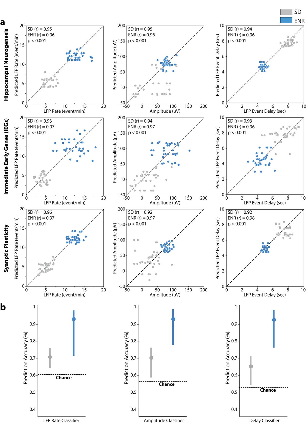 图6. 多尺度转录功能数据的机器学习预测。a) 应用XGBoost算法从SD和ENR数据中各指定基因家族的转录组数据预测网络电生理指标(LFP频率、振幅和LFP事件延迟)。通过皮尔逊相关系数®评估SD和ENR条件下从转录组数据预测n-电生理指标的效果。所有基因家族中预测的SD与ENR值之间存在显著差异 ,ANOVA)。b) 所有基因家族的最终数据输出迭代显示,XGBoost对ENR数据的预测精度高于SD数据,其性能通过平均准确度值比较得以体现。计算得出的均值及三个标准差被确定处于随机阈值范围内。