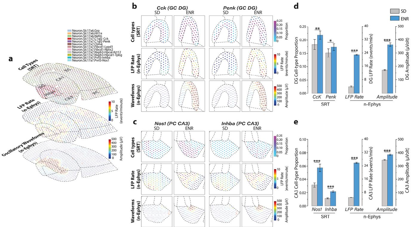 图5. 空间细胞类型及其放电模式特征分析。a) 将CARD方法整合至MEA-seqX平台可获得具有空间分辨率的细胞类型组成及其振荡放电特性。该展示包含通过SRT读数、LFP频率以及从全海马网络n-Ephys读数得出的振荡波形所确定的占比前20位的细胞类型。b) 针对齿状回区域的检测提供了细胞类型空间分辨率组成及其相应振荡放电特征的深度视图。c) 同样地,在CA3锥体细胞网络内进行的区域评估揭示了细胞类型空间组成及其相应振荡放电特征。d) ENR转录组在齿状回颗粒细胞类型中显示出更高比例的空间定位标记基因Cck和Penk,相较于SD转录组显著升高。同时ENR表现出比SD更高的LFP频率与振幅 , , ANOVA, , ANOVA)。e) CA3区域分析表明,与SD转录组相比,ENR转录组中与锥体细胞类型相关的空间定位标记基因Nos1和Inhba比例升高,这与功能网络尺度上更高的LFP频率和振幅存在相关性(*** , ANOVA)。