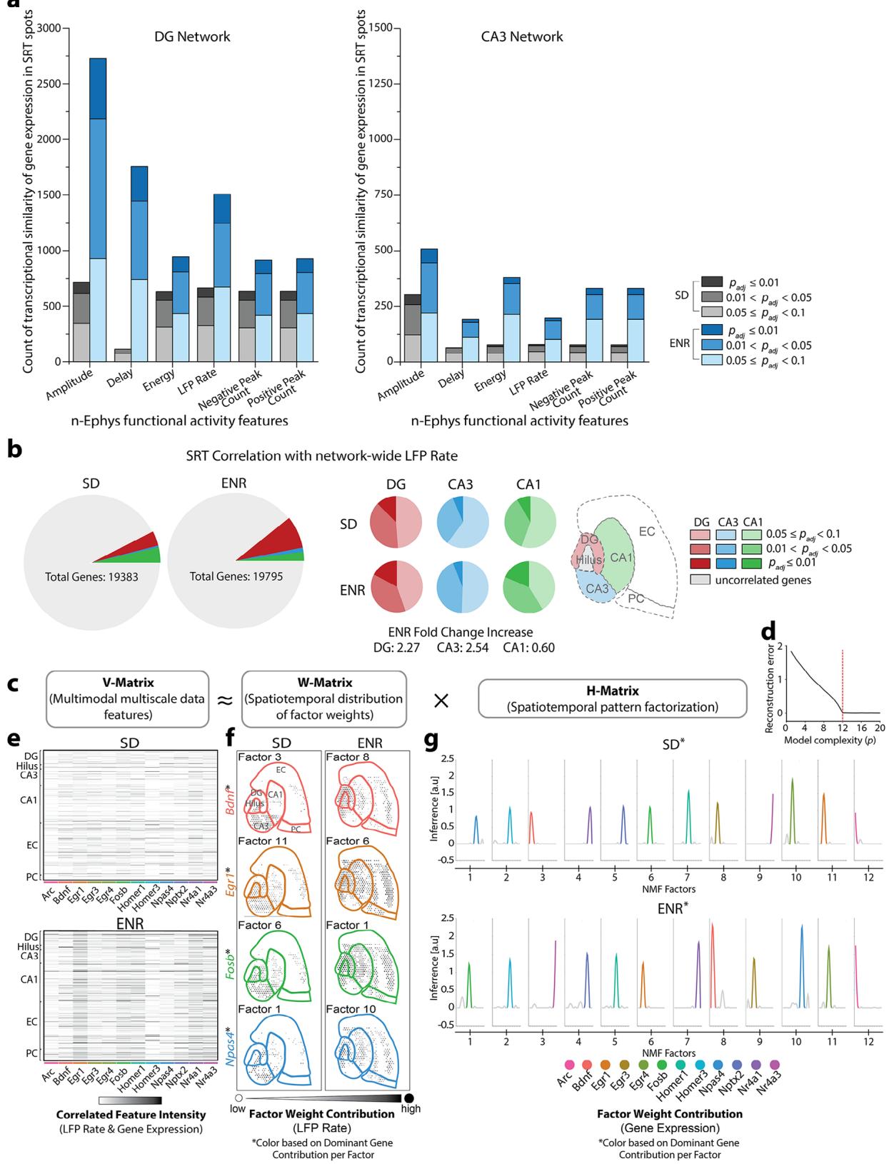 接下来,为识别整合性SRT与n-Ephys模态中不同的时空模式,我们采用稀疏约束非负矩阵分解(NMF)[28]的无监督机器学习算法。该方法能够将多模态数据分解为差异表达的基因子网络、空间位点及网络电生理特征集合,从而实现降维与结果可解释性(图2c)。即刻早期基因(IEGs)在连接空间转录模式与局部场电位活动方面表现出显著贡献(图S3,支持信息)。为确定NMF分解中降维模型需识别的最优组件数量(即因子p),我们评估了在不同模型复杂度下重建V矩阵的效果。重建误差[29]的两个线性区间在 处呈现明显拐点,此时增加更多模式仅能边际提升拟合质量(图2d)。输入的V表达矩阵包含SRT与n-Ephys(即LFP频率)数据的整合信息,每个条目代表特定空间位点中与网络功能特征相关联的基因表达水平(图2e),该矩阵被分解为两个非负矩阵:基底W矩阵包含分解后的空间基因表达模式及其位点信息,反映功能特征在空间位点间的贡献分布(图2f);系数H矩阵则表征基因表达模式对每个空间位点及n-Ephys功能特征谱的推断贡献度(图2g)。本分析揭示了ENR网络中标准化基因表达与网络特征值的增强,以及驱动基因表达强度的空间解析组件提升。此外,我们还发现空在SD和ENR网络中部分特定子网络的研究中,凸显出具有主导贡献的基因,例如Bdnf、Egr1、Fosb和Npas4。