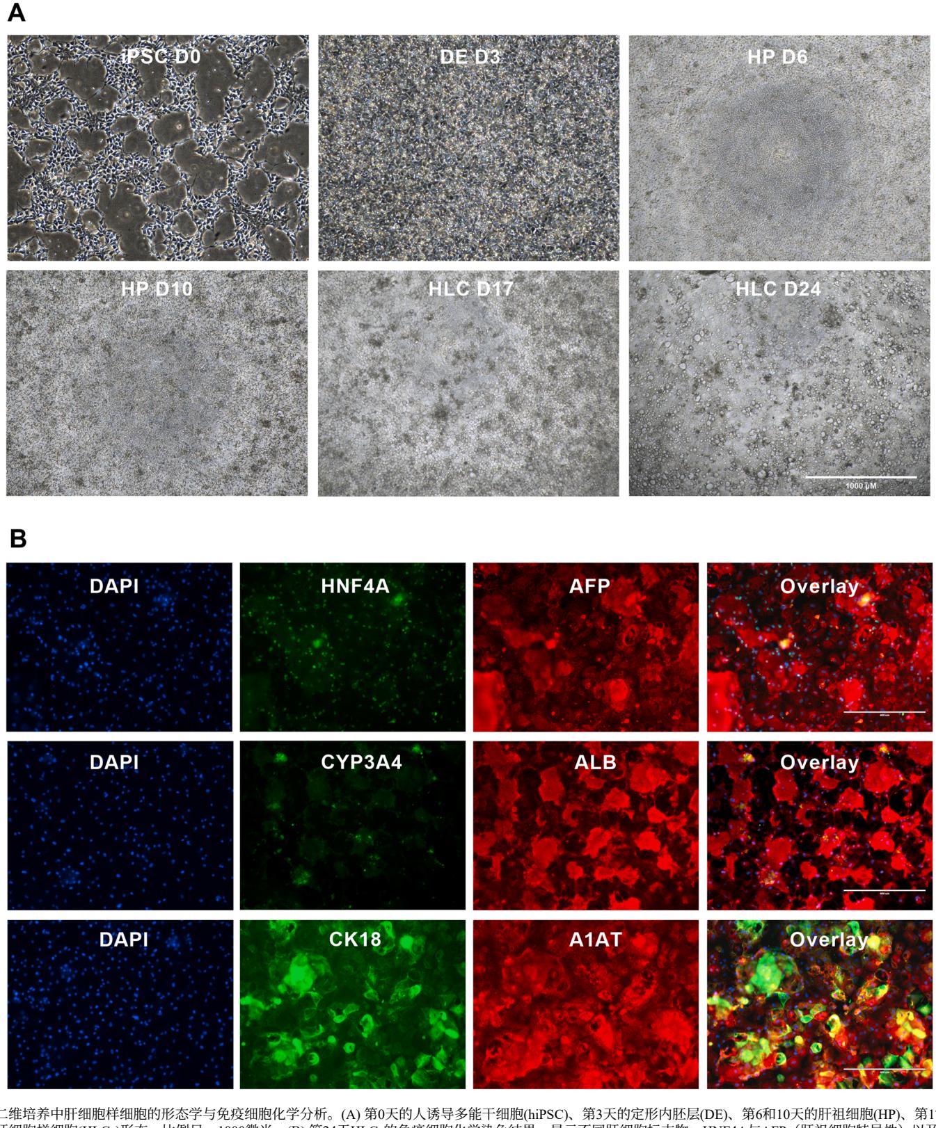 果。这些方案均遵循从hiPSC向定型内胚层分化,经肝祖细胞阶段最终获得成熟肝细胞样细胞的分化路径。研究团队首先建立了优化的定型内胚层诱导方案[28],在分化启动第3天可获得超过90%的SOX17/FOXA2双阳性细胞(图3A及附图1)。随后相继开发出优化的肝祖细胞[6]与肝细胞样细胞[9]诱导方案(图3A)。最终获得的肝细胞样细胞呈现典型肝细胞形态:大多角形结构、具有单/双显著核仁的清晰圆形细胞核以及明亮连接的细胞间隙。这些细胞已通过免疫细胞化学显示成熟肝细胞标志物的染色,包括HNF4A、AFP、ALB、CK18、A1AT和CYP3A4(图3 B)。此外通过肝细胞特异性引物(包括HNF4A、AFP(肝祖细胞特异性)、ALB及CYP3A4(肝样细胞特异性))进行qRT-PCR对肝样细胞进行进一步表征。在为期四周的分化过程中,观察到未成熟与较成熟肝样细胞标志物的表达增加(图4 A)。此外,CYP3A4报告细胞系在分化过程中的检测结果显示通过Nano-Glo 检测(报告基因检测)并经CellTiter-Glo 读数(基于ATP水平的细胞存活率)标准化后,结果显示CYP3A4在分化过程中持续增加,验证了其作为衡量肝细胞成熟度有效工具的价值(图4B)。
