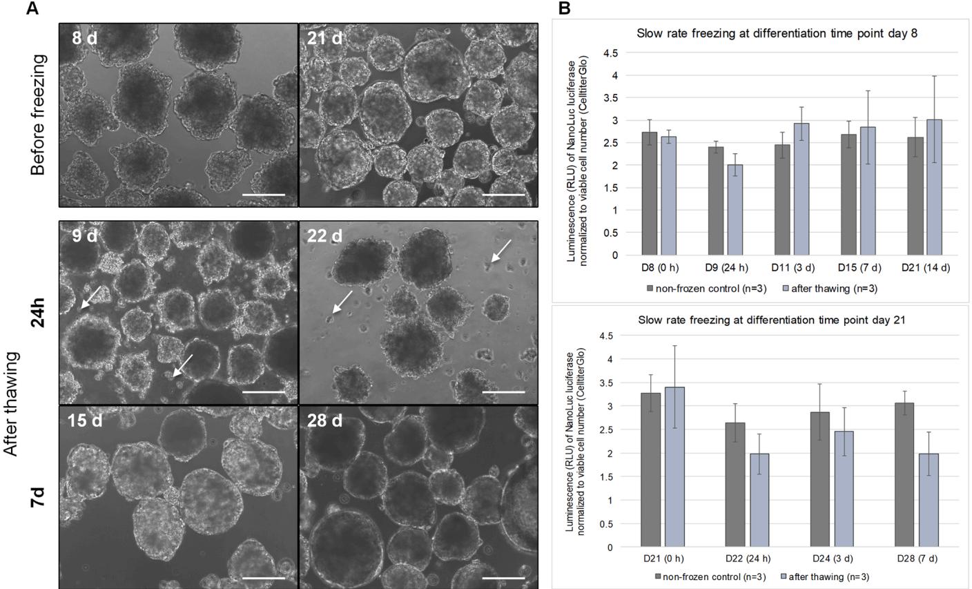 在分化过程中的两个时间点研究了冷冻保存方法。图2提供了从2D到3D分化转化的概念验证,以及3D细胞系统的冷冻保存和相应的质量控制。为了分析冷冻保存后不同成熟状态类器官的恢复情况,分别在早期3D分化的第8天和3D分化结束时的第21天进行了冷冻。