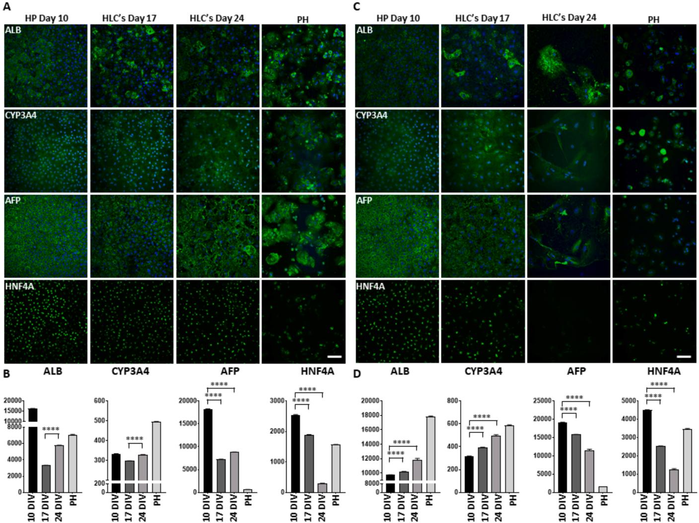 图5. 在96孔板和384孔板中iPSC衍生HLCs的形态学特征评估。(A) 免疫荧光染色代表性图像,显示96孔板中培养10、17和24天后PHH、HP及HLC的ALB、CYP3A4、AFP和HNF4A抗体表达。(B) 96孔板中培养10、17和24天后PHH、HP及HLC单位细胞免疫荧光信号量化分析。(C) 免疫荧光染色代表性图像,显示384孔板中培养10和17天后PHH、HP及HLC的ALB、CYP3A4、AFP和HNF4A抗体表达。(D) 384孔板中培养10和17天后PHH、HP及HLC单位细胞免疫荧光信号量化分析。标尺= 100微米。(****p值< 0.0001)。