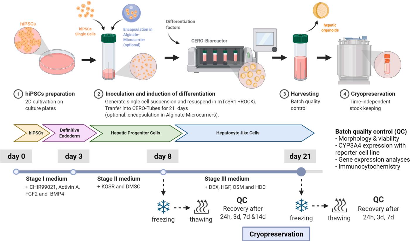 图2.人iPSCs来源肝细胞在悬浮培养(3D)中的分化流程概览。第一步是建立从起始阶段到成熟阶段的稳健2D HLCs分化体系。第二步将该方案转化为基于悬浮生物反应器CERO3D(OLS)的3D培养模式。最后在分化过程的两个时间点(第8天和21天)对肝类器官进行冷冻保存,以评估其冻存效率。分化过程中的各项质控指标以及复苏后的状态验证了肝类器官的质量。本图使用Biorender软件绘制。