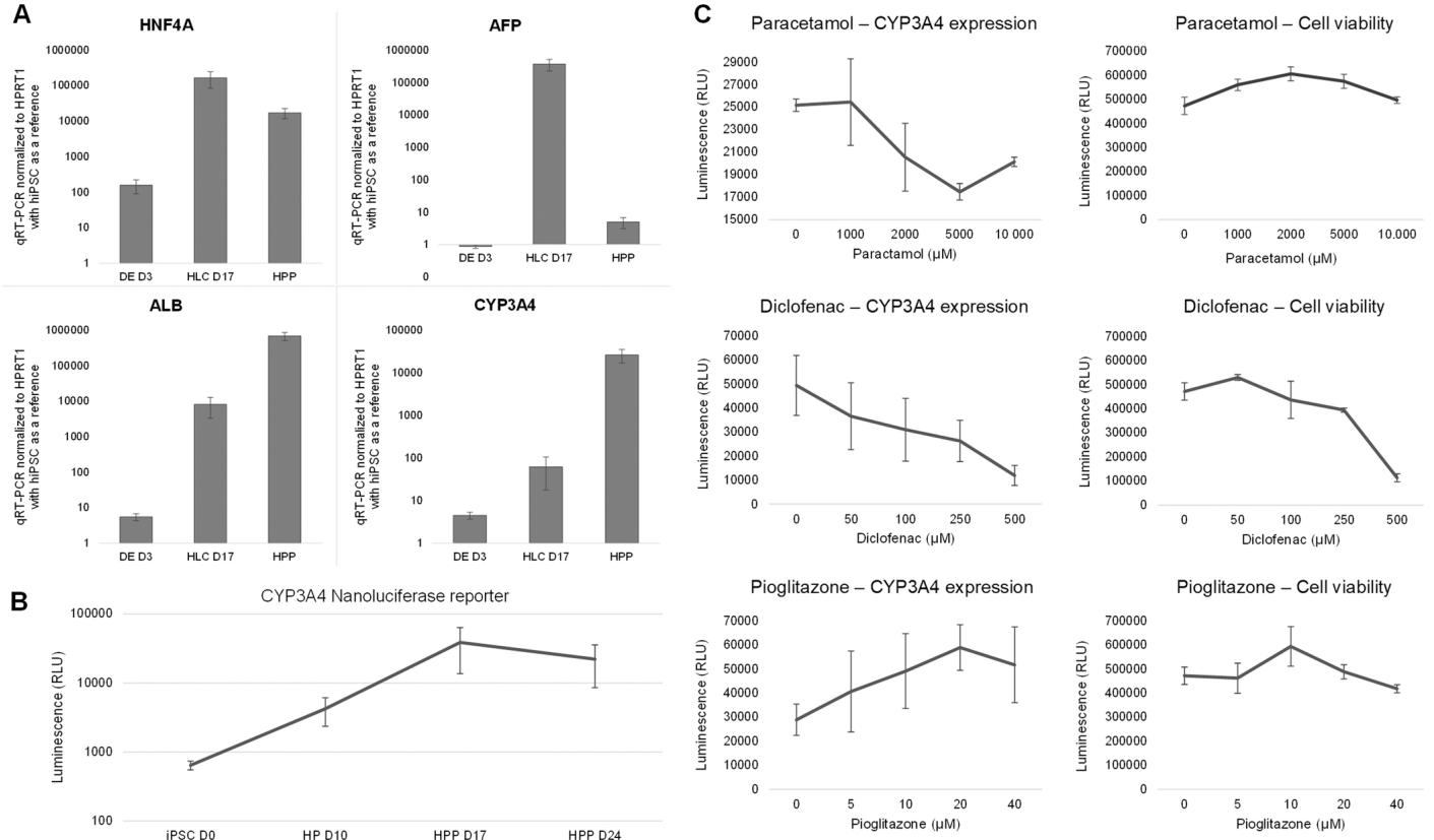 图4. 验证和使用 CYP3A4 纳米荧光素酶报告基因的药物测试。(A) 使用相关肝标志物(HNF4A、AFP、ALB、CYP3A4)的 qRT-PCR。(B) 在2D肝细胞分化过程中,来自 CYP3A4 报告基因系的 HLCs 使用 Nano-Glo 测定法(CYP3A4 报告基因)的荧光素酶读数。(C) 在来自 CYP3A4 报告基因的 HLCs 上测试不同参考药物,随后使用 Nano-Glo 测定法(CYP3A4 表达)或 CellTiter-Glo ATP 为基础的活力测定法(细胞活力)进行发光读数,平均值 ± 标准差,n = 3。