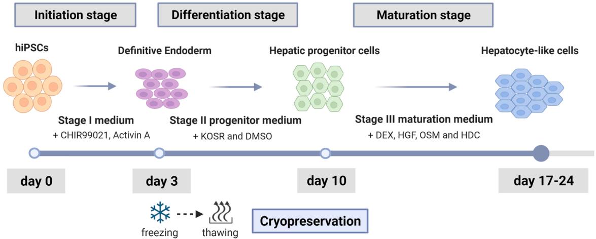 图1.人iPSCs在单层培养(2D)中分化为肝细胞的工作流程概览。在起始阶段,hiPSCs被诱导分化为定形内胚层细胞,并在分化和成熟阶段持续分化至第17-24天。第3天时将定形内胚层细胞作为中间产物冻存。本图使用biorender软件绘制。
