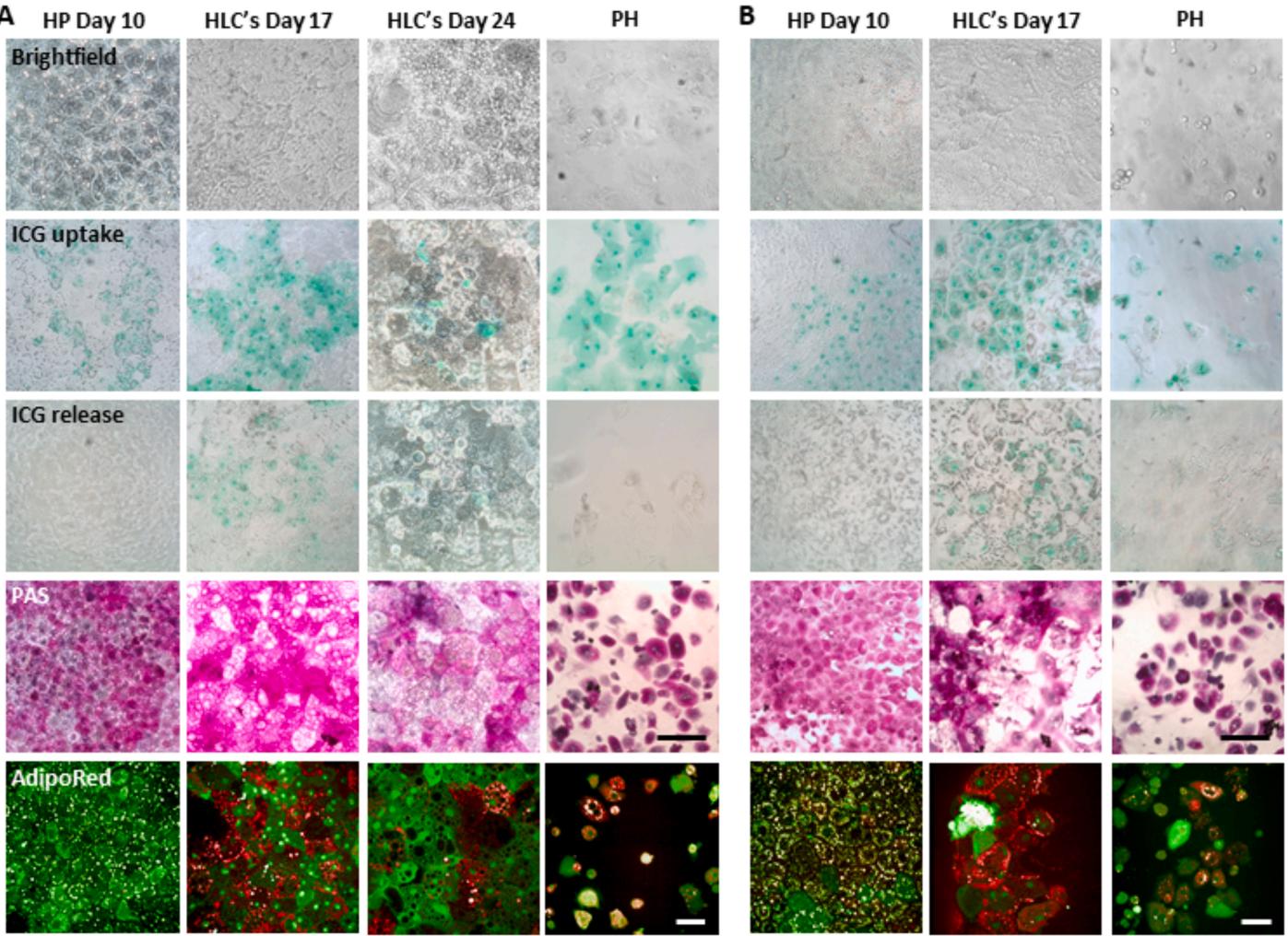 图6. hiPSC来源的HLC在96孔板(A)和384孔板(B)中的功能特征评估。明场图像显示96孔板(A)中培养10、17和24天后以及384孔板(B)中培养10和17天后HLC的形态。PAS染色显示96孔板(A)中培养10、17和24天后以及384孔板(B)中培养10和17天后原代肝细胞、PHH和HLC的糖原储存情况。AdipoRed™检测显示96孔板(A)中培养10、17和24天后以及384孔板(B)中培养10和17天后原代肝细胞、HP和HLC的细胞内甘油三酯储存。ICG摄取实验显示96孔板(A)中培养10、17和24天后以及384孔板(B)中培养10和17天后原代肝细胞、HP和HLC的肝脏摄取功能。比例尺= 500 µm适用于明场、PAS和ICG检测,比例尺= 50 µm适用于AdipoRed™检测。