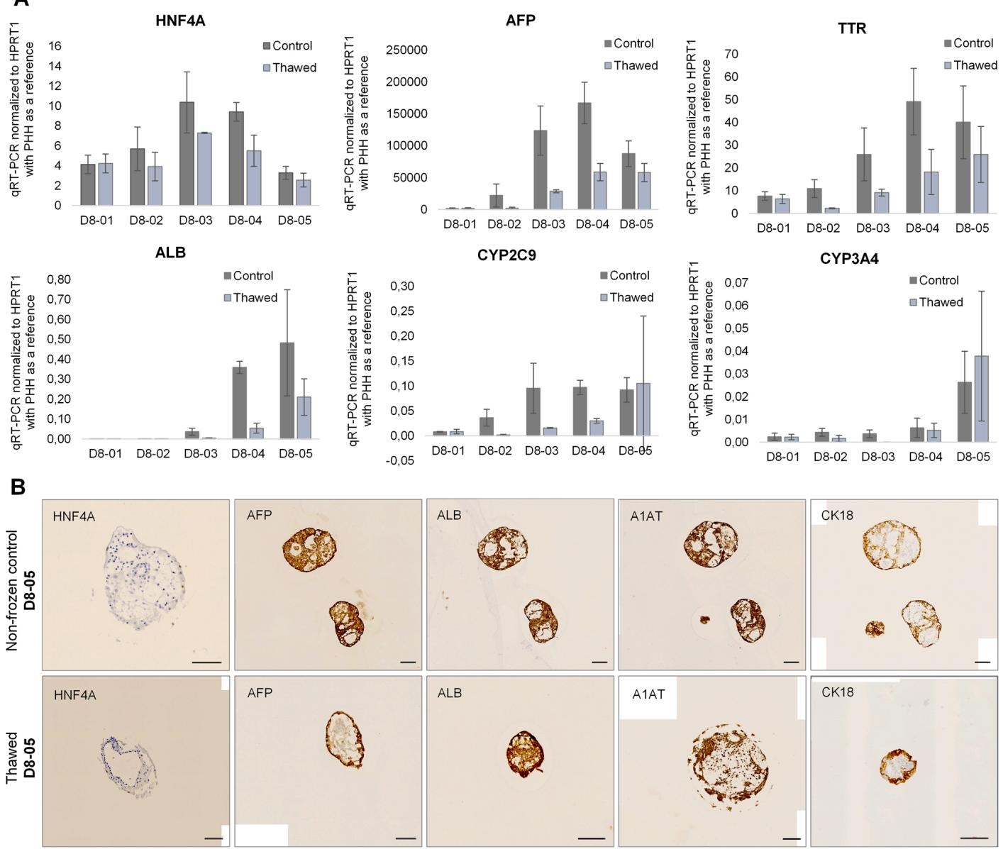 图8. (A) 通过RT-qPCR检测相关肝脏标志物(HNF4A、AFP、TTR、ALB、CYP2C9和CYP3A4)对未冷冻及第8天冷冻类器官进行验证。类器官在从第8天至第21天的不同分化时间点进行分析(D8–01:解冻后0小时,D8–02:解冻后24小时,D8–03:解冻后3天,D8–04:解冻后7天,D8–05:解冻后14天),数据表示为均值±标准差,n=3。(B) 解冻21天后未冷冻及第8天冷冻类器官的代表性免疫细胞化学图像,显示不同肝细胞特异性标志物包括HNF4A、AFP、ALB、A1AT和CK18。比例尺=100 µm。